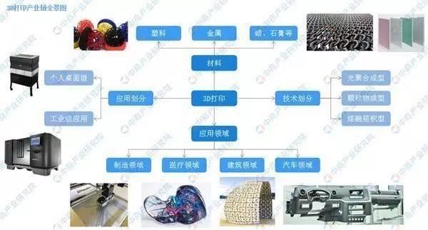 3D打印行業產業鏈從上中下游來看,上游為塑料、金屬、蠟、石膏、砂等其他各種材料。中游為3D打印設備及技術,下游則為制造、醫療、建筑、軍事等應用領域。